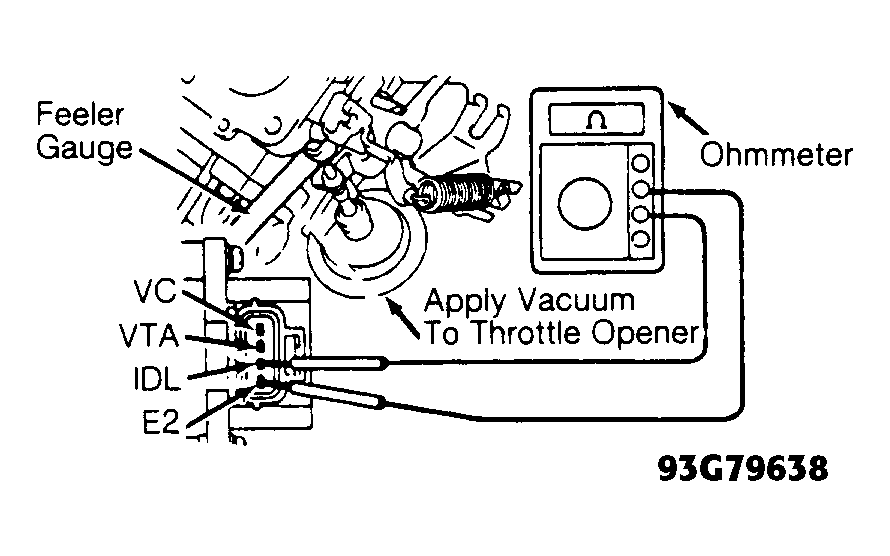 - Insert specified thickness feeler gauge between throttle stop screw and throttle lever and check resistance or continuity. See appropriate TPS RESISTANCE SPECIFICATIONS table. Replace or adjust TPS if not within specification.