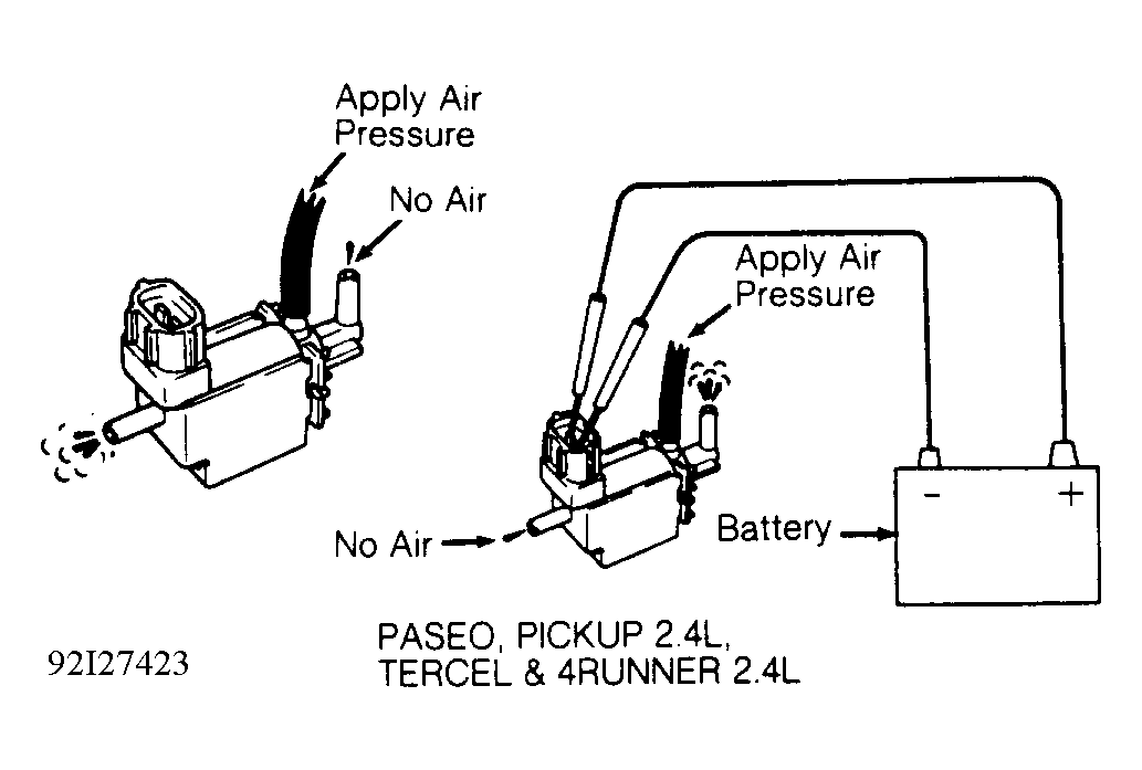 5. Check fuel pressure control VSV operation by applying air pressure to designated area and checking air passage, and then applying battery voltage and ground and retesting. See Fig 1. Replace fuel pressure control VSV if defective.