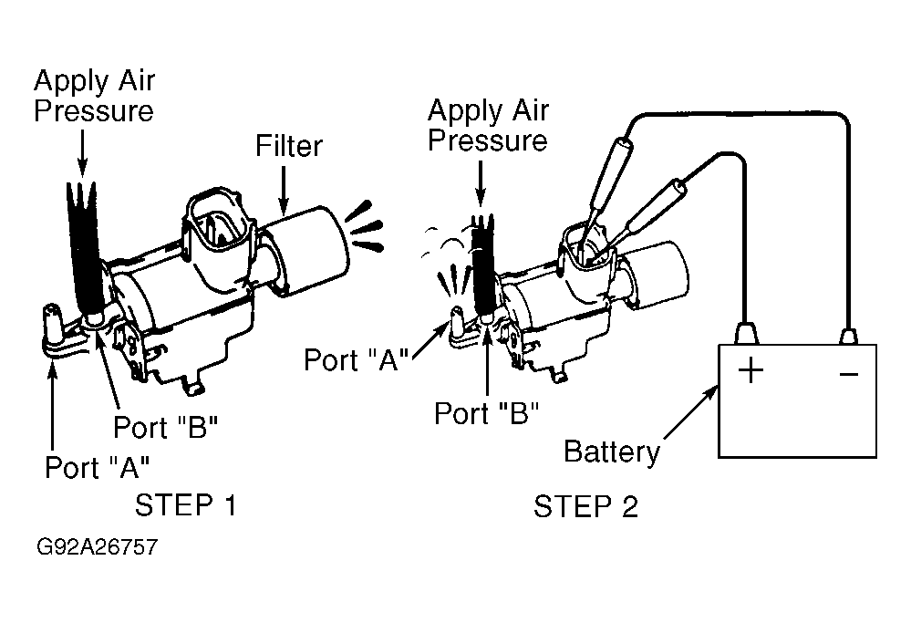 - Disconnect hoses from vacuum tank, located near driver's side front corner of engine compartment, below battery tray. Apply air pressure to port "B" on vacuum tank. Ensure air passes out port "A". Perform STEP 1. See Fig 2. Apply air pressure to port "A". Ensure air does not pass out port "B". Perform STEP 1. See Fig 2.