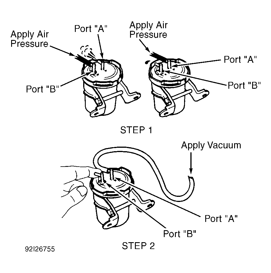 - Plug port "B" on vacuum tank. Using vacuum pump, apply about 8 in. Hg of vacuum to port "A". Perform STEP 2. See Fig 2. Ensure vacuum reading will hold for at least one minute. Replace vacuum tank if defective and recheck system operation. If vacuum tank is okay, reconnect vacuum hoses. Proceed to next step.