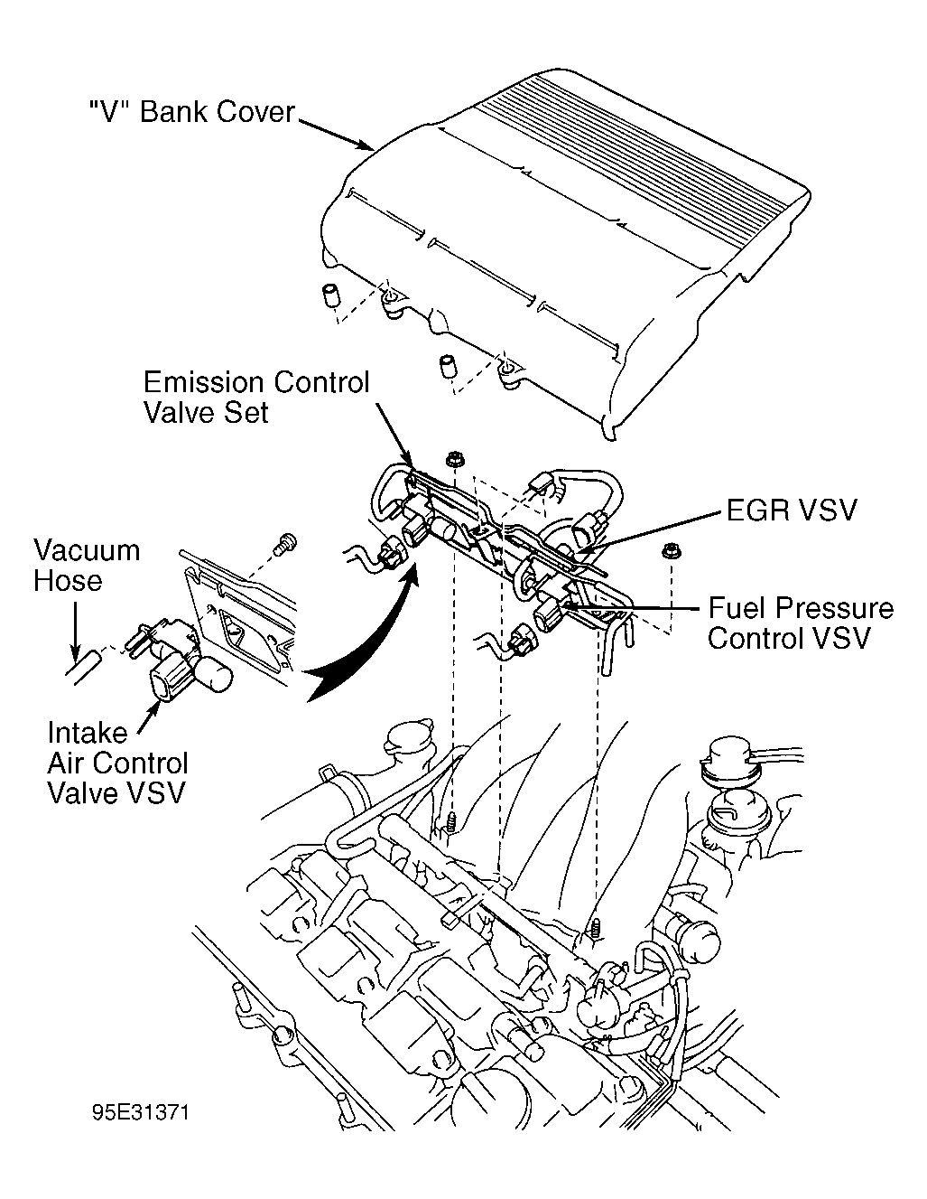 - Remove "V" bank cover, located on top of engine. See Fig 3. Disconnect electrical connector and vacuum hoses from intake air control valve Vacuum Switching Valve (VSV), located near valve cover. See Fig 3.NOTE: It may be necessary to remove emission control valve set which contains various vacuum switching valves for access to intake air control valve VSV.