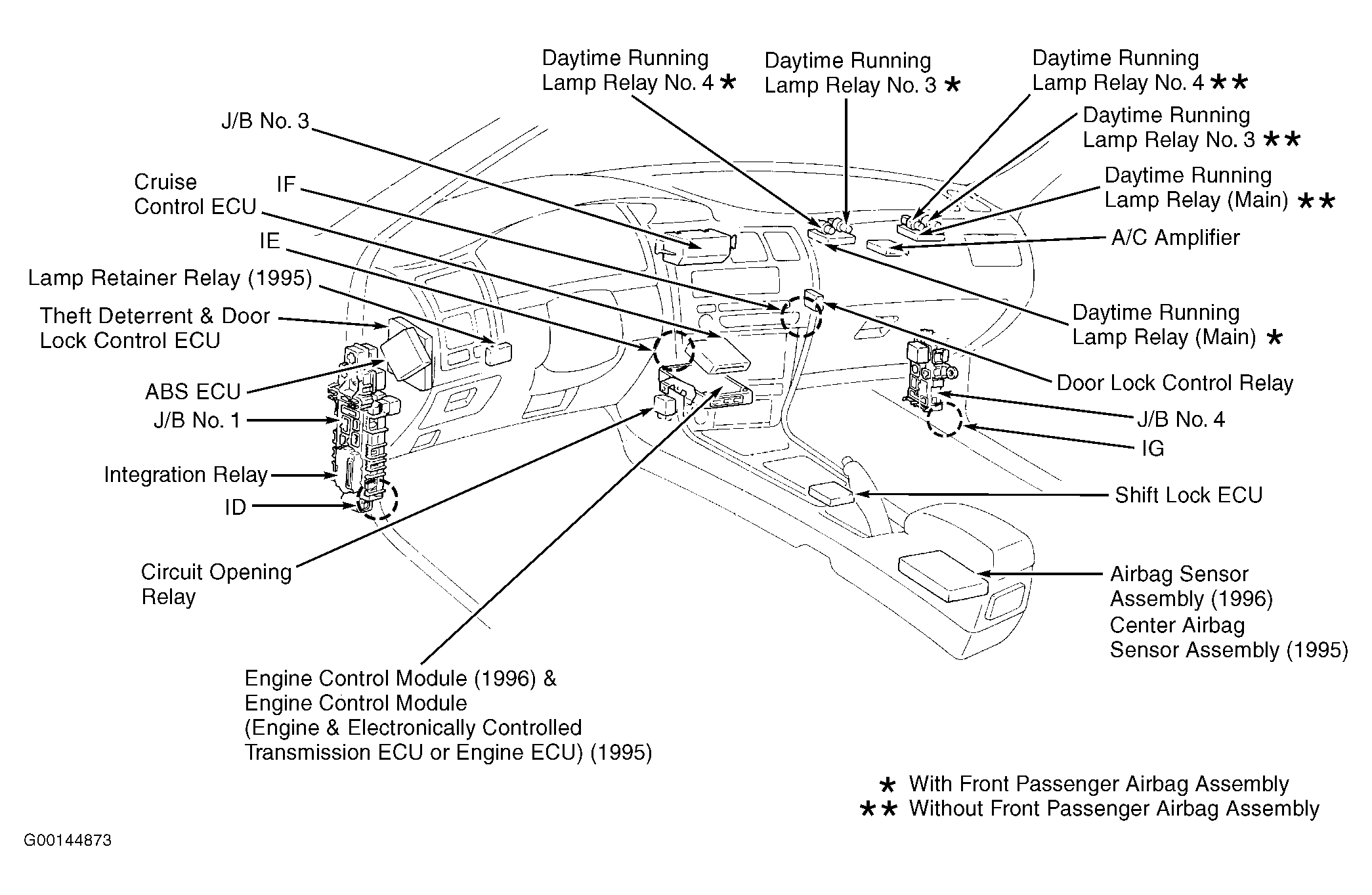 | Fuse Block (1996) | On top left side of J/B No. 1. |