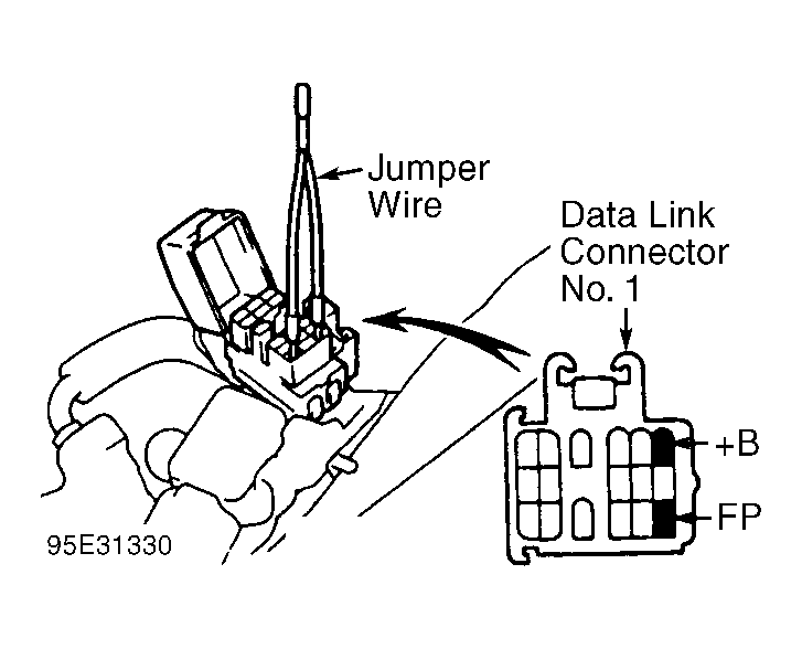- Install Jumper Wire (SST 09843-18020) between +B and FP terminals of data link connector No. 1. See Fig 1.NOTE: Data link connector No. 1 is located in engine compartment.
