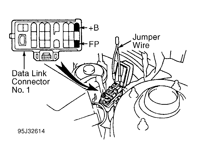 - Install Jumper Wire (SST 09843-18020) between +B and FP terminals of data link connector No. 1. See Figure. Turn ignition on and note fuel pressure.
