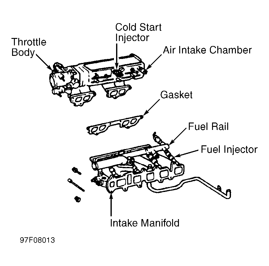- Remove union bolts, gaskets and cold start injector fuel pipe. Cold start injector fuel pipe is located between cold start injector and the fuel rail. Remove bolts, cold start injector and gasket from air intake chamber.