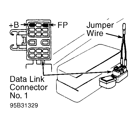 - Install Jumper Wire (SST 09843-18020) between +B and FP terminals of data link connector No. 1. See Figure. Turn ignition on and note fuel pressure.