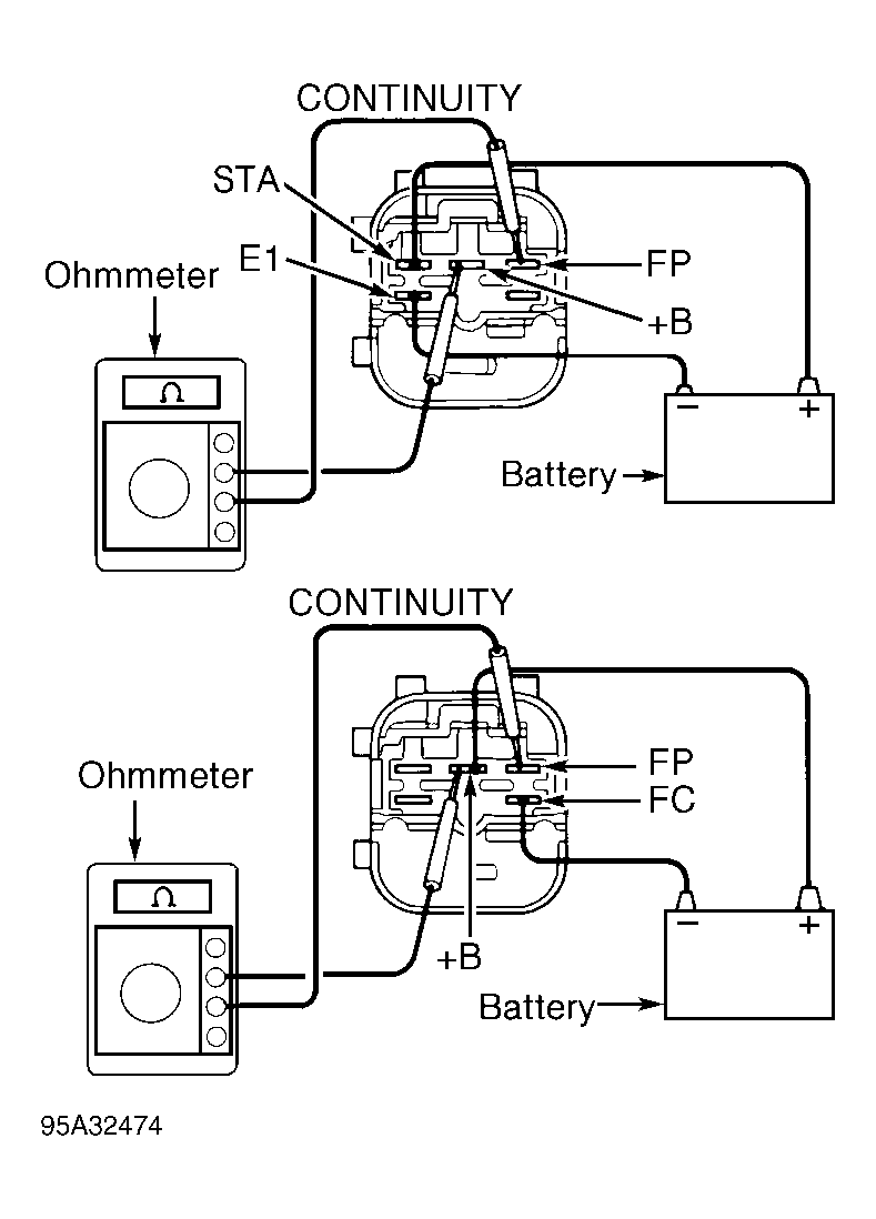 - Check circuit opening relay operation by applying battery voltage and ground and checking continuity between specified terminals. See Fig 2. Replace circuit opening relay if defective.
