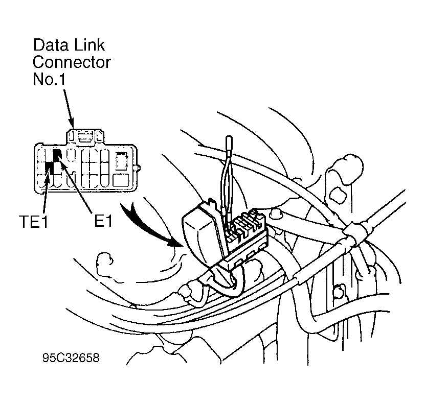 - Apply parking brake and place transmission/transaxle in Neutral. Install Jumper Wire (SST 09843-18020) between terminals TE1 and E1 of data link connector No. 1. See Fig 1. Start engine and note RPM.