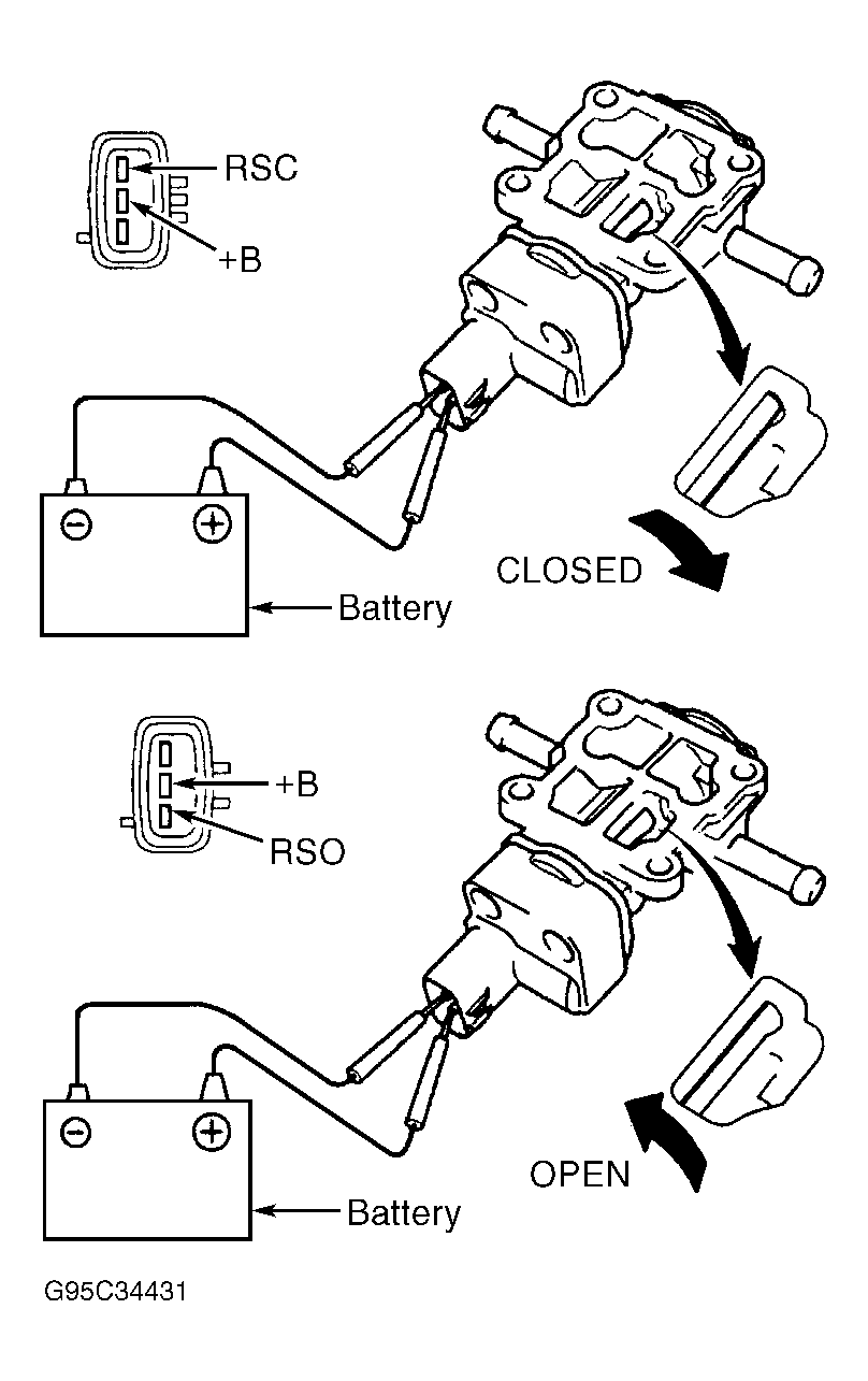 - To check IAC valve operation, remove IAC valve from throttle body. Connect battery voltage and ground to proper terminals and ensure valve opens and closes. See Fig 3. Replace IAC valve if defective.