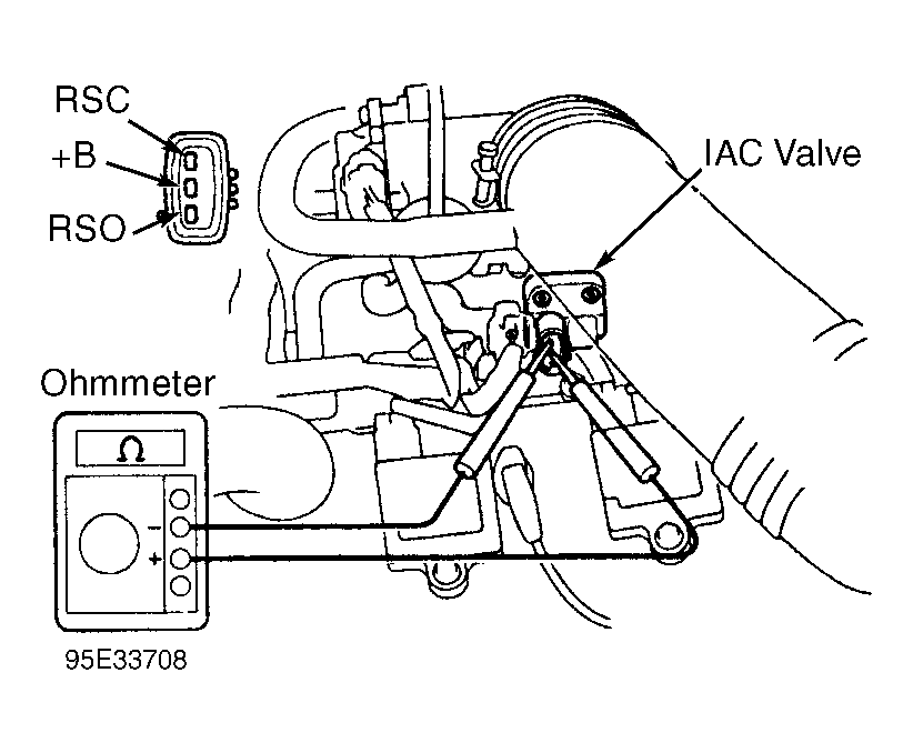 - To check IAC valve resistance, ensure ignition is off. Disconnect electrical connector from IAC valve located on lower area of throttle body. Using ohmmeter, measure resistance between terminal B+ or +B and each remaining terminal. See Fig 2.