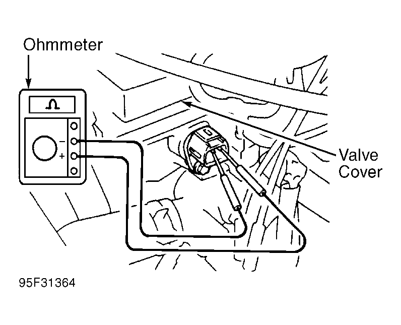- Disconnect electrical connector from camshaft position sensor, located on rear of cylinder head, just below valve cover. See Fig 1. Using ohmmeter, measure resistance between electrical terminals on camshaft position sensor. See Fig 1.