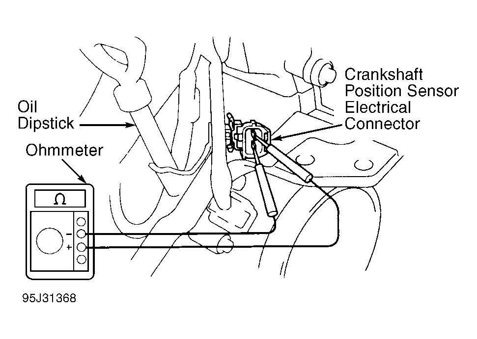 - Replace crankshaft position sensor if resistance is not 985-1600 ohms at 14-122°F (-10-50°C) and 1265-1890 ohms at 122-212°F (50-100°C). Reinstall electrical connector for crankshaft position sensor.