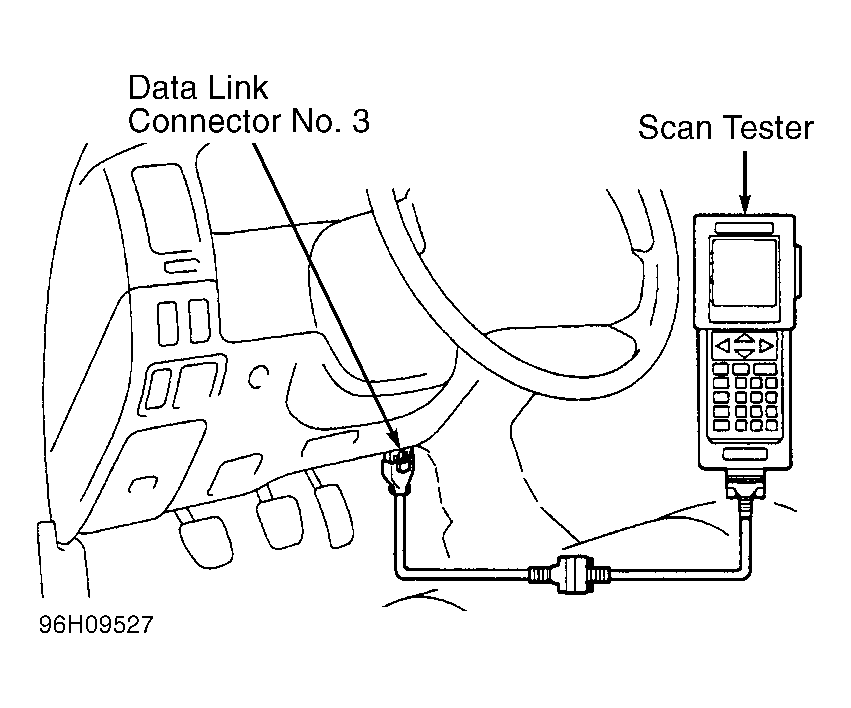 - Remove cover (if equipped) and install scan tester on data link connector No. 3. See Figure. Turn ignition on. DO NOT start engine.