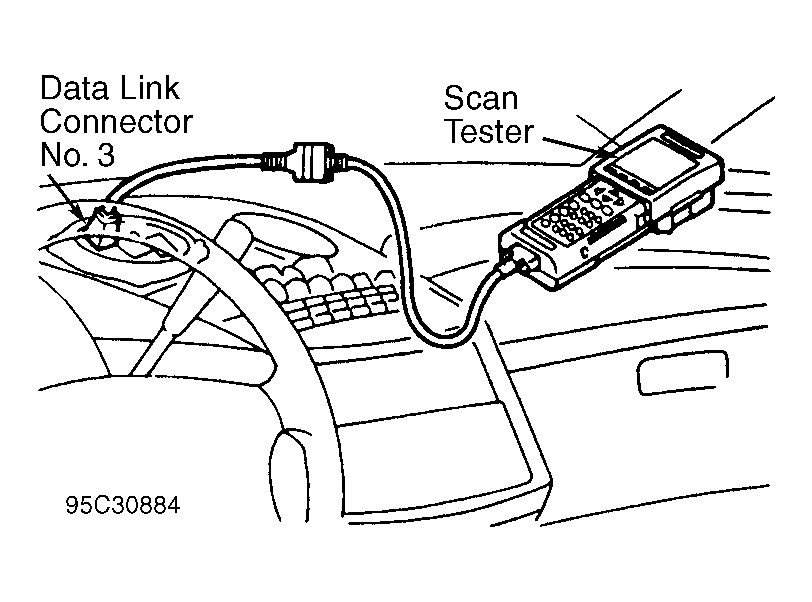 - Start and warm engine to normal operating temperature. Shut engine off. Connect timing light to spark plug wire on cylinder No. 1 (front cylinder at timing chain end of engine). Remove upper panel from instrument panel and connect scan tester to data link connector No. 3. See Fig 1. Scan tester is used to read engine RPM.