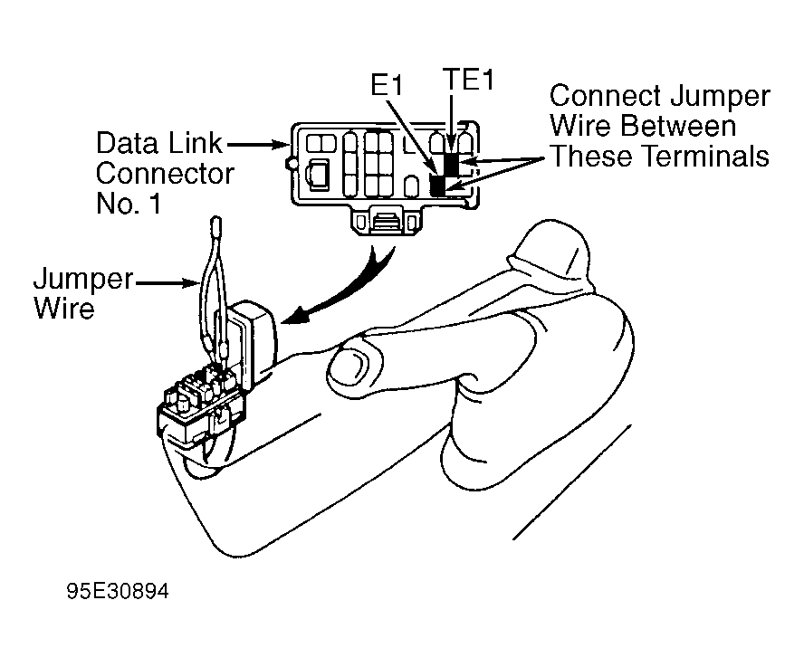 - Install Jumper Wire (SST 09843-18020) between terminals TE1 and E1 of data link connector No. 1. See Fig 2.