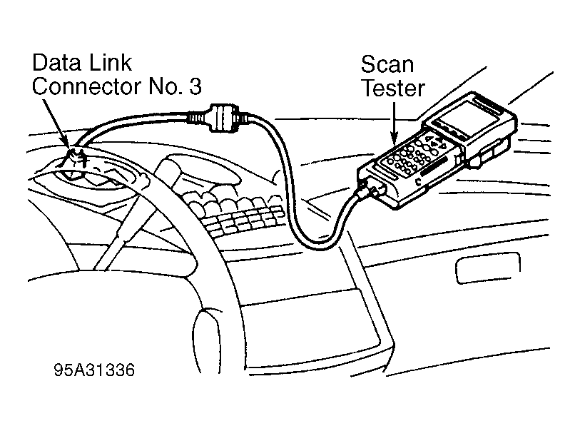 - Remove cover (if equipped) and install scan tester on data link connector No. 3. See Figure. Turn ignition on. DO NOT start engine.