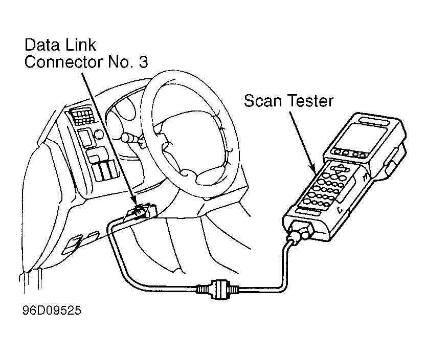 1. Remove cover (if equipped) and install scan tester on data link connector No. 3. See Figure. Turn ignition on. DO NOT start engine.
