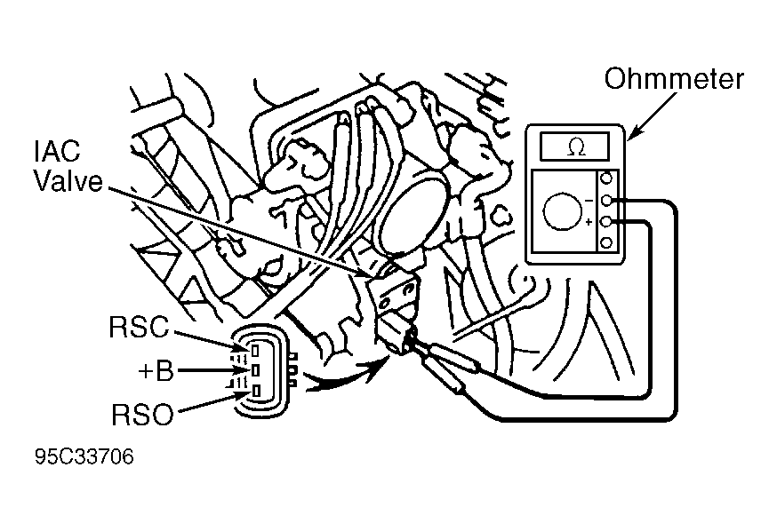 - To test IAC valve resistance, ensure ignition is off. Disconnect electrical connector from IAC valve, located on lower area of throttle body. Using ohmmeter, check resistance between terminal +B and each remaining terminal. See Fig 2.