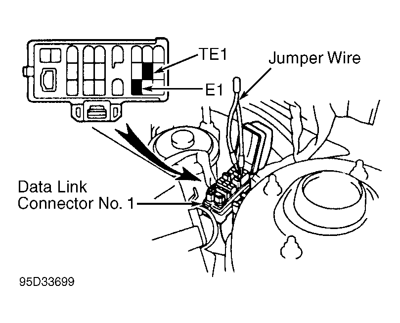 - Apply parking brake and place transmission/transaxle in Neutral. Install Jumper Wire (SST 09843-18020) between terminals TE1 and E1 of data link connector No. 1. See Fig 1. Start engine and note RPM.NOTE: Data link connector No. 1 is located in engine compartment.