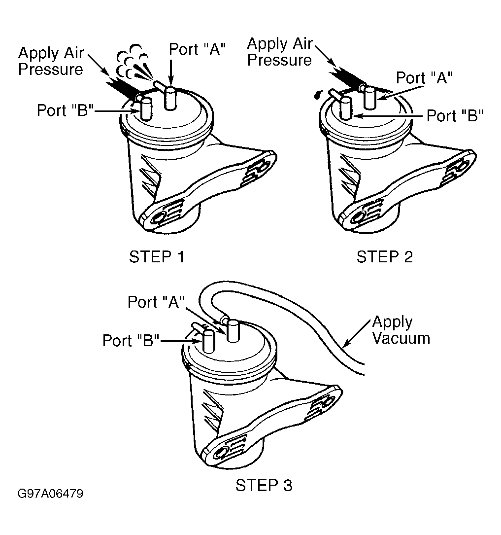 - Plug port "B" on vacuum tank. Using vacuum pump, apply 8 in. Hg of vacuum to port "A". Perform STEP 3. See Fig 2. Ensure vacuum reading will hold for at least one minute. Replace vacuum tank if defective and recheck system operation. If vacuum tank is okay, reconnect vacuum hoses. Proceed to next step.