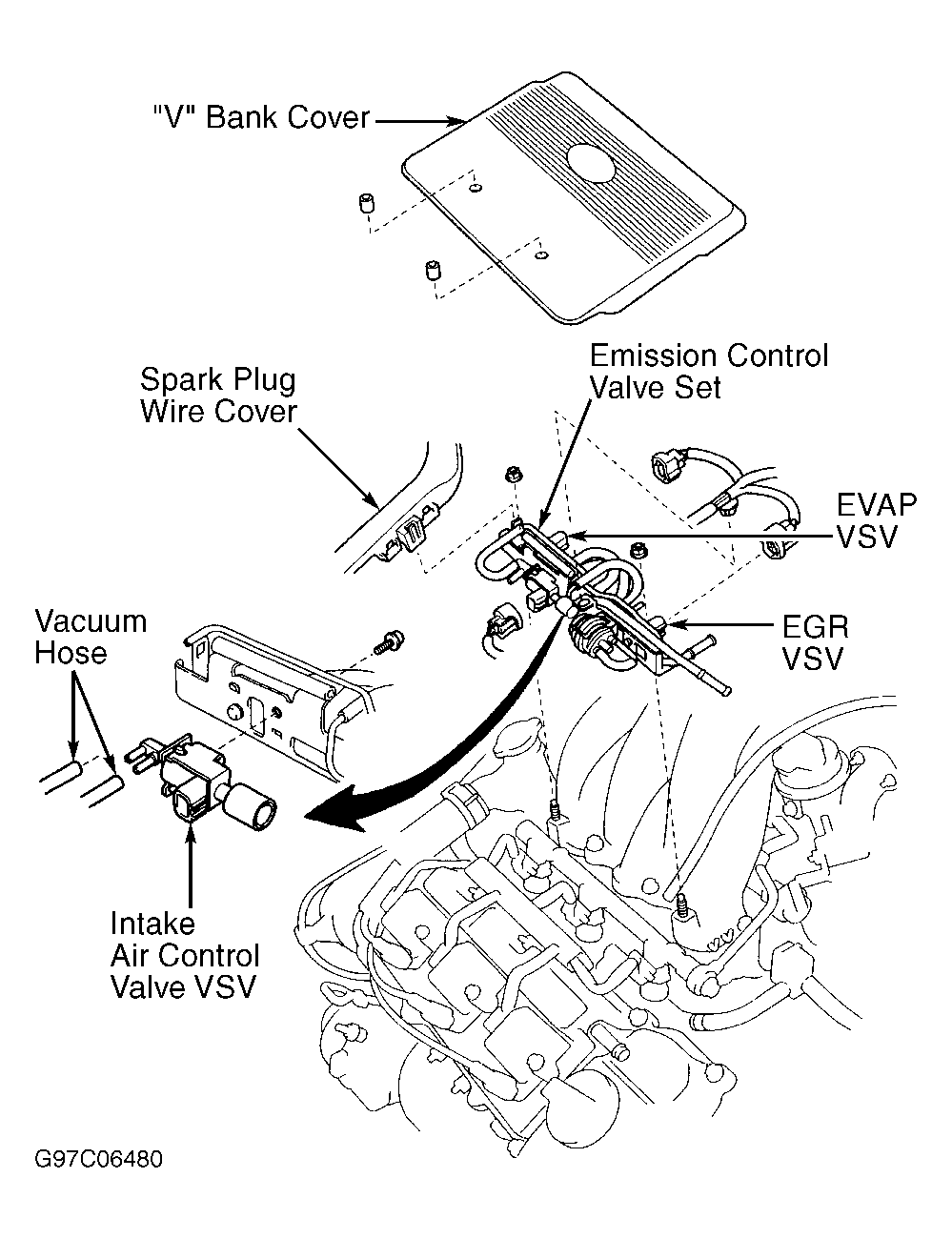 - Ensure ignition is off. Remove "V" bank cover located on top of engine for access to fuel injectors. See Figure.