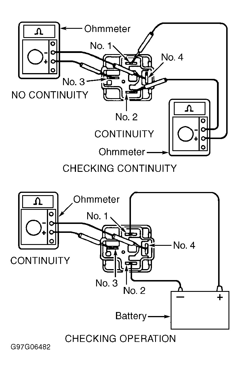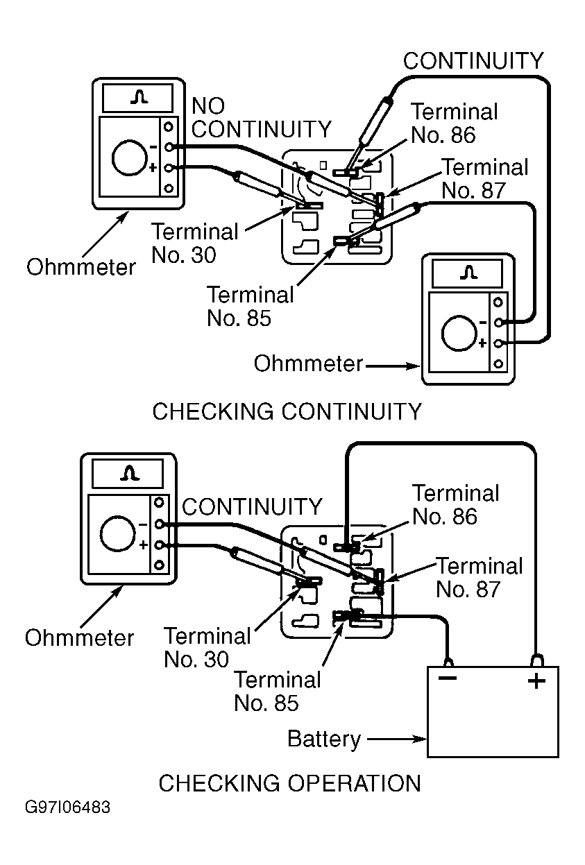 - To test circuit opening relay operation, apply battery voltage and ground to relay and use ohmmeter to check continuity between specified terminals. See Figure and Figure. Replace circuit opening relay if defective.