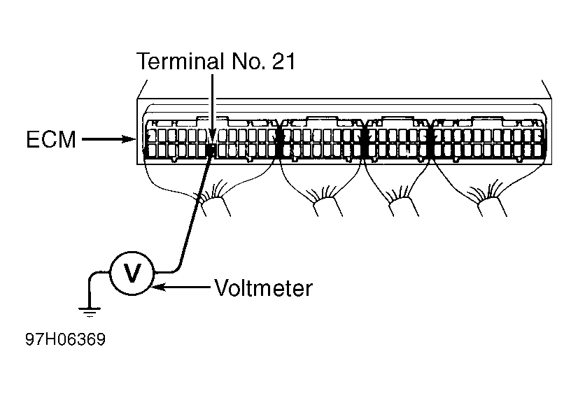 2. Turn ignition on. Using voltmeter, check voltage between terminal No. 21 (Red/Blue wire) on ECM and chassis ground. See Fig 1.