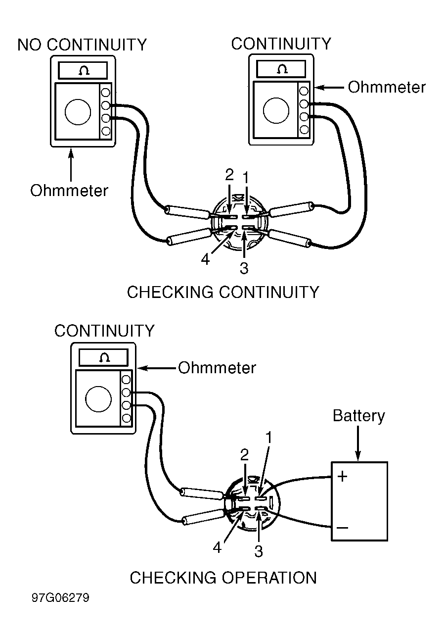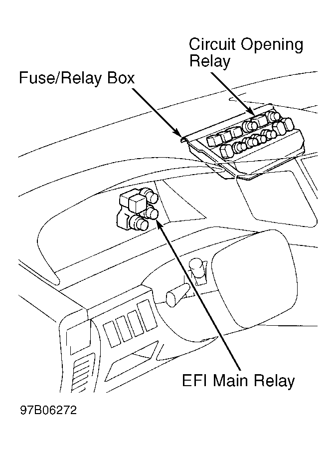 - To check EFI main relay operation, apply battery voltage and ground to relay and use ohmmeter to check continuity between specified terminals. See Fig 1. Replace EFI main relay if defective.