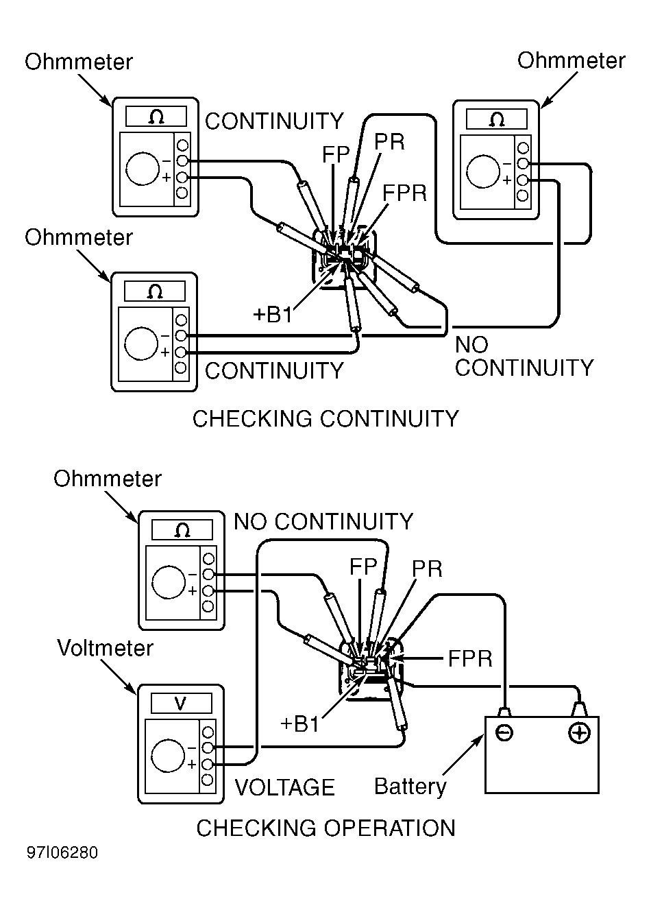 2. To check fuel pump relay continuity, use ohmmeter to check continuity between specified terminals. See Fig 2. Continuity should exist between terminals +B1 and FPR, and terminals +B1 and FP. No continuity should exist between terminals +B1 and PR.