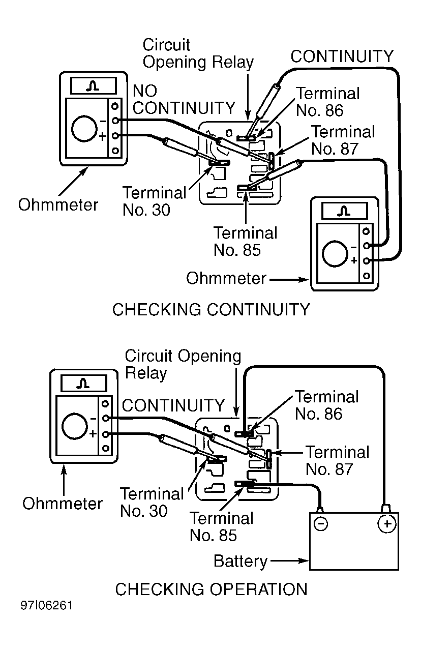 2. To check circuit opening relay continuity, use ohmmeter to check continuity between specified terminals. See Fig 2.