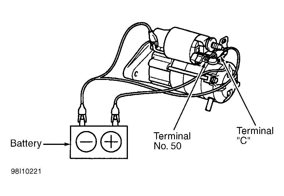 Disconnect field coil lead from terminal "C". Connect jumper wires from negative battery terminal to terminal "C" and to starter housing. When wire is connected from positive battery terminal to terminal No. 50, clutch pinion gear should extend fully. See Figure, Figure or Figure . If clutch pinion gear does not move, replace solenoid. If clutch pinion gear does move, go to next test. - Hold-In Coil Test