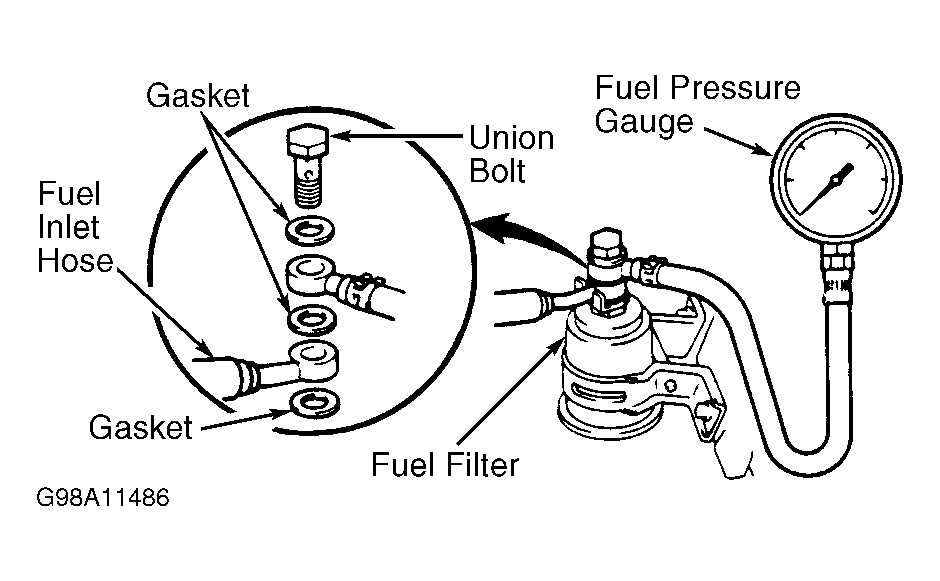 - Disconnect negative battery cable. Remove fuel pressure gauge. Using NEW gaskets, reinstall fuel inlet hose on fuel filter. Tighten union bolt to 21 ft. lbs. (29 N.m).