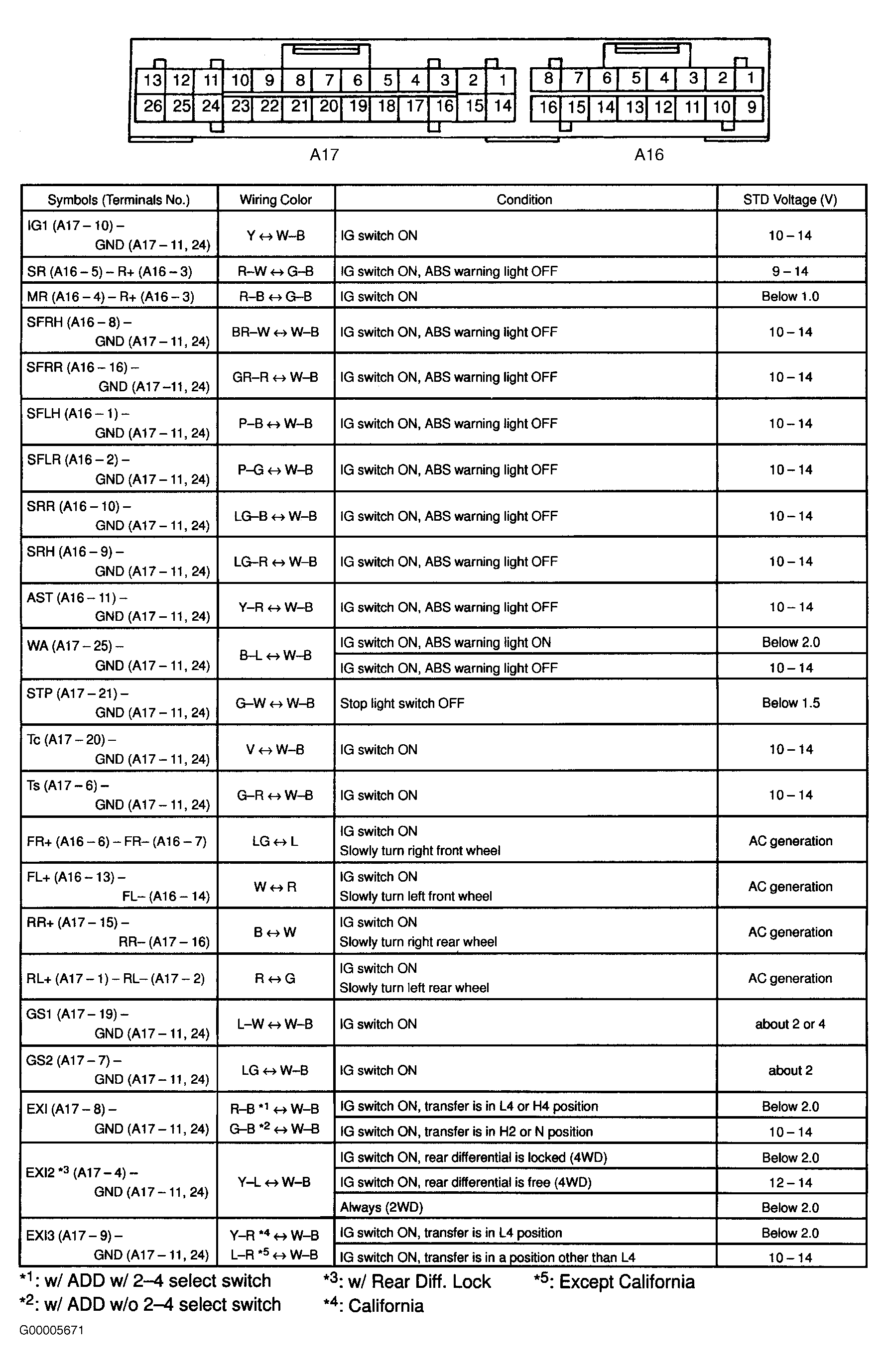 Components are tested with related circuit. See DIAGNOSTIC TESTS . ABS ECU values can be measured using Toyota hand-held tester and breakout box. ABS circuits and harness can also be tested by backprobing ABS ECU connectors and comparing measured voltages with ABS ECU standard values chart. See Fig 1.