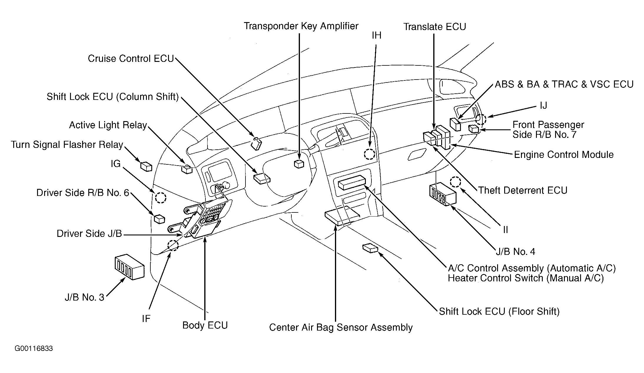 | J/B No. 3 | Behind left kick panel. See Figure. |