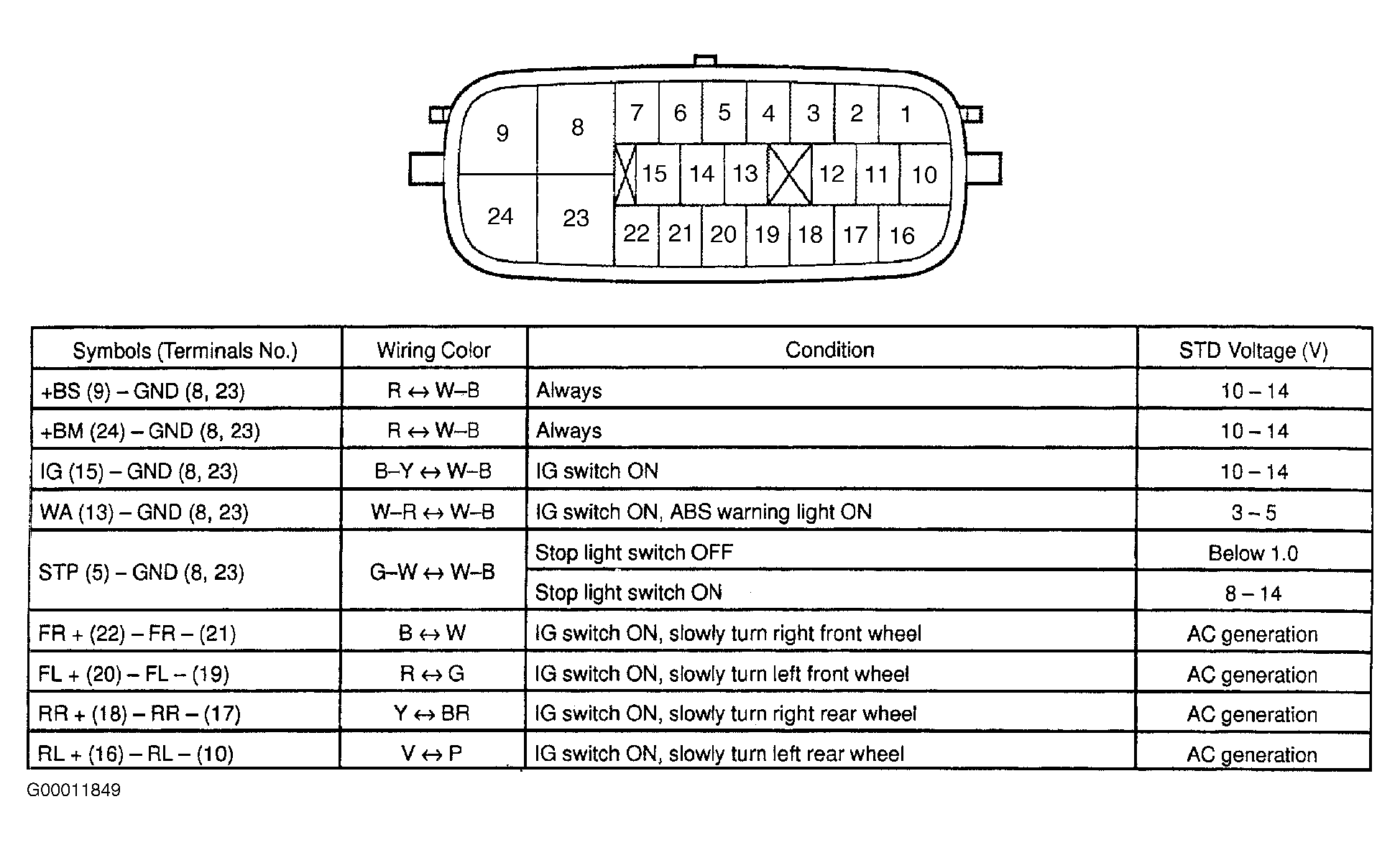 For identification of ABS ECU terminals and circuits, see