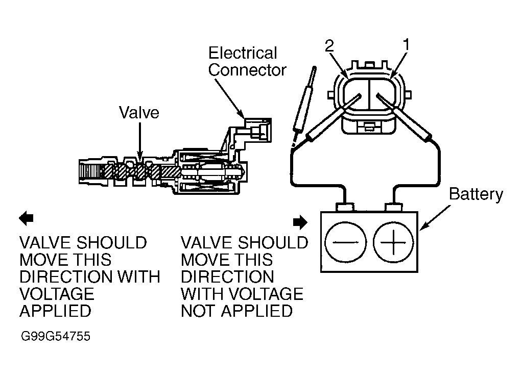 5. With VVT OCV removed, connect a fused jumper wire between positive battery terminal and terminal No. 1 at VVT OCV. See Figure. Connect another jumper wire between negative battery terminal and terminal No. 2 at VVT OCV and note VVT OCV plunger operation. With battery voltage applied, plunger on end of VVT OCV should extend. Disconnect a jumper wire. Without battery voltage applied, plunger should retract. If VVT OCV operates as specified, go to next step. If VVT OCV does not operate as specified, replace VVT OCV and go to next step.