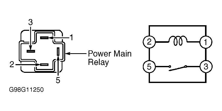 Remove power main relay. Check continuity between power main relay terminals No. 1 and 2. See Fig 1. Continuity should exist. Using jumper wires, apply battery voltage between terminals 1 and 2. Check continuity between terminals No. 3 and 5. Continuity should exist while battery voltage is applied. Continuity should not exist when battery voltage is removed. If continuity is not as specified, replace power main relay.