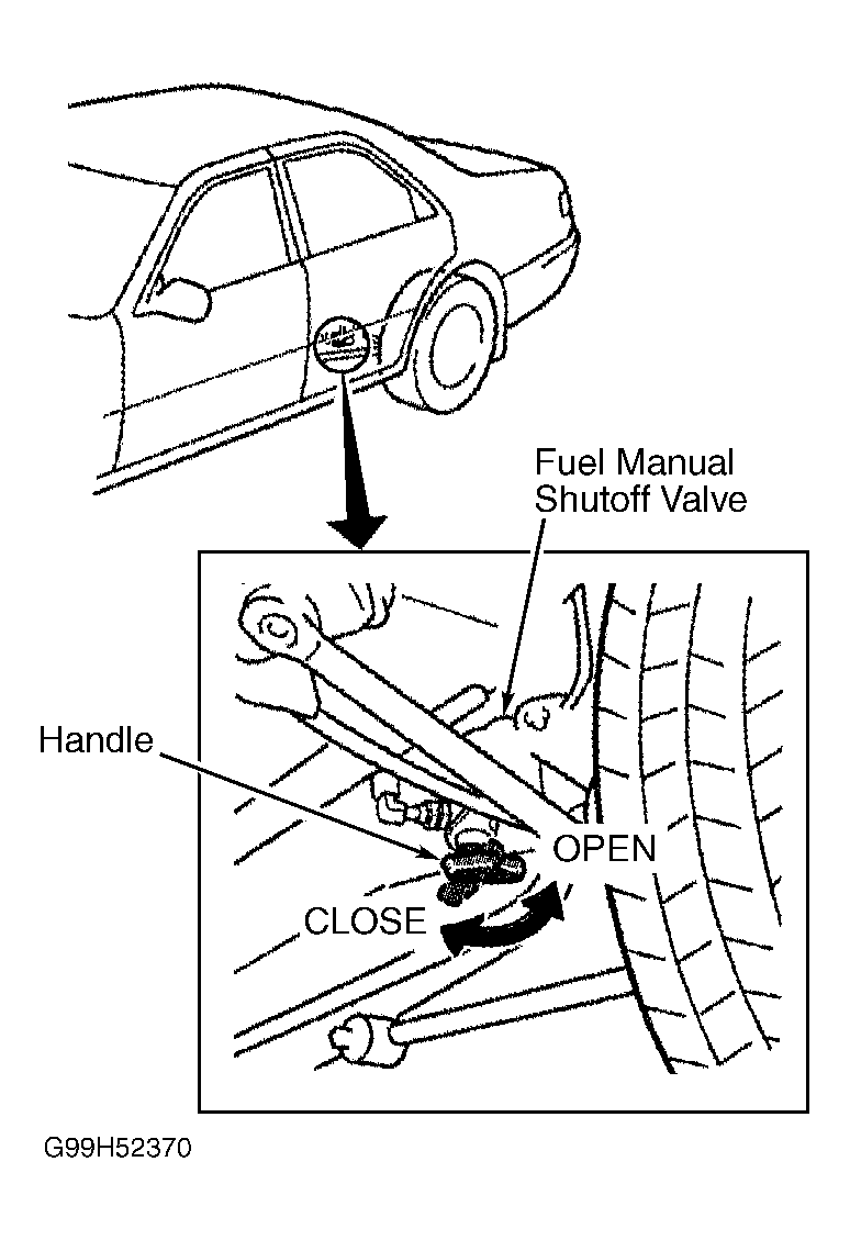 - Rotate handle on fuel manual shutoff valve to CLOSED position. Fuel manual shutoff valve is located near driver's side rear tire, underneath the vehicle, near fuel lines just below fuel tank behind the rear seat. See Fig 1.