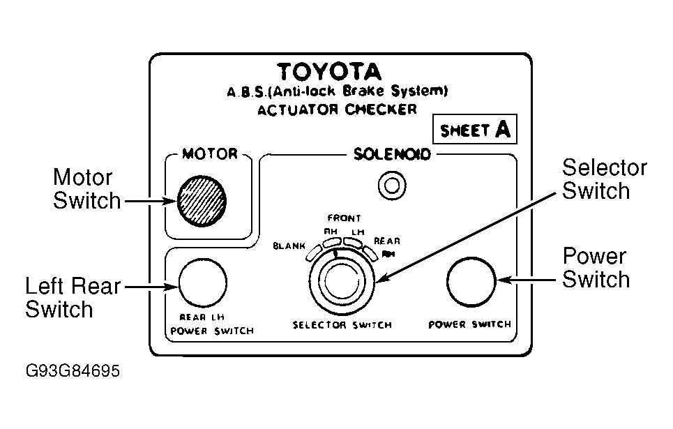 - Place Sheet "A" (09990-00163) on actuator checker. Start engine and let idle. Turn actuator checker SELECTOR switch to FRONT RH position. See Fig 1. Press and hold MOTOR switch for a few seconds. Ensure motor can be heard running. Depress and hold brake pedal for 15 seconds. Ensure brake pedal does not go down. While holding brake pedal, press MOTOR switch for a few seconds. Ensure brake pedal does not pulsate.
