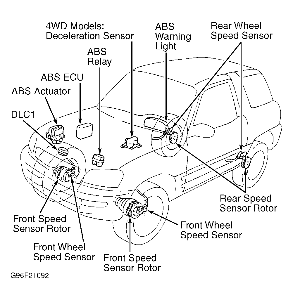 Anti-Lock Brake System (ABS) consists of hydraulic actuator, solenoids, pump motor, ABS Electronic Control Unit (ECU), relays, deceleration sensor (4WD) and wheel speed sensors. See Fig 1.