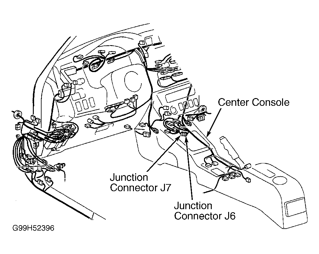 - Check for open in wiring harness and electrical connectors between ECM and junction connectors J6 and J7. See appropriate wiring diagram in STARTERS article in STARTING & CHARGING SYSTEMS. Junction connectors J6 and J7 are located near center console. See Fig 1.