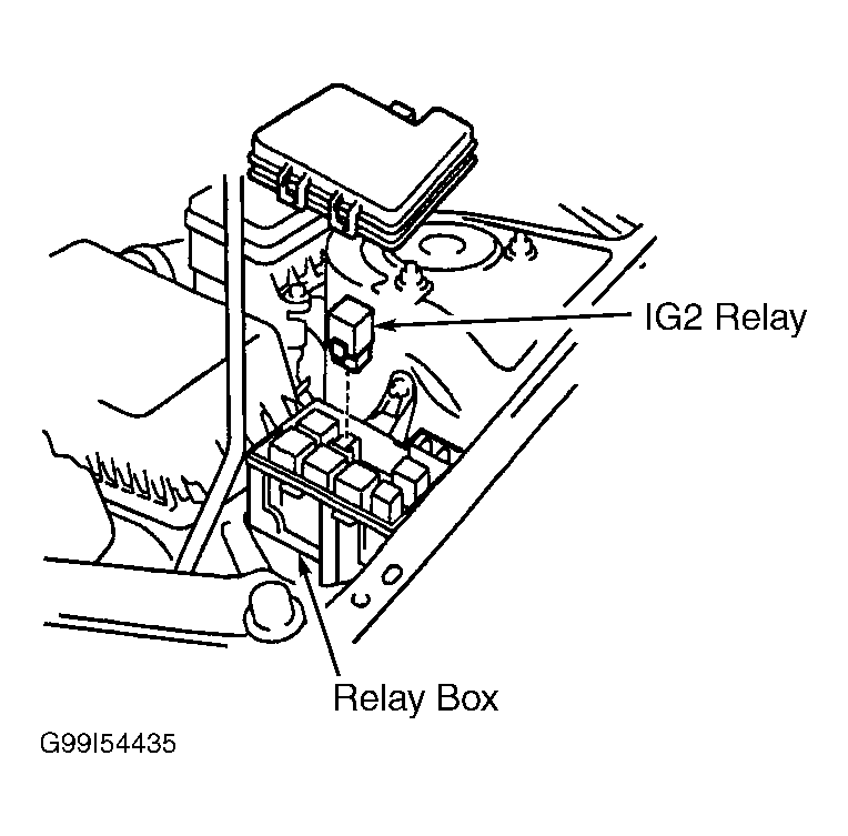 - Remove IG2 relay from relay box located at driver-side front corner of engine compartment, just in front of strut tower. See Fig 1.