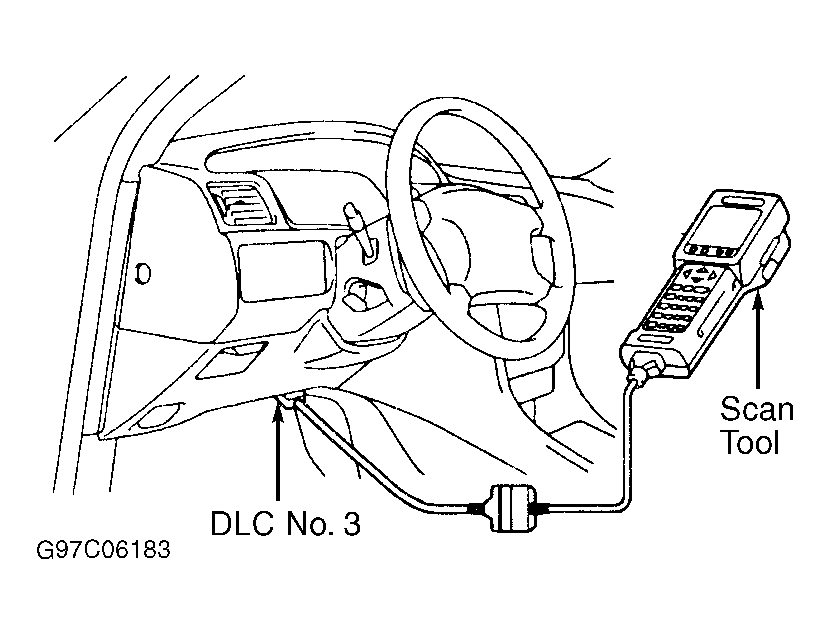 1. Connect scan tool to Data Link Connector (DLC) No. 3. See Figure. Record any DTCs and freeze frame data. Switch scan tool to CHECK mode (Toyota hand-held tester only). Drive vehicle several times with engine speed, load and its surrounding range shown with ENGINE SPD, CALC LOAD in freeze frame data or MISFIRE RPM and MISFIRE LOAD in scan tool data list.
