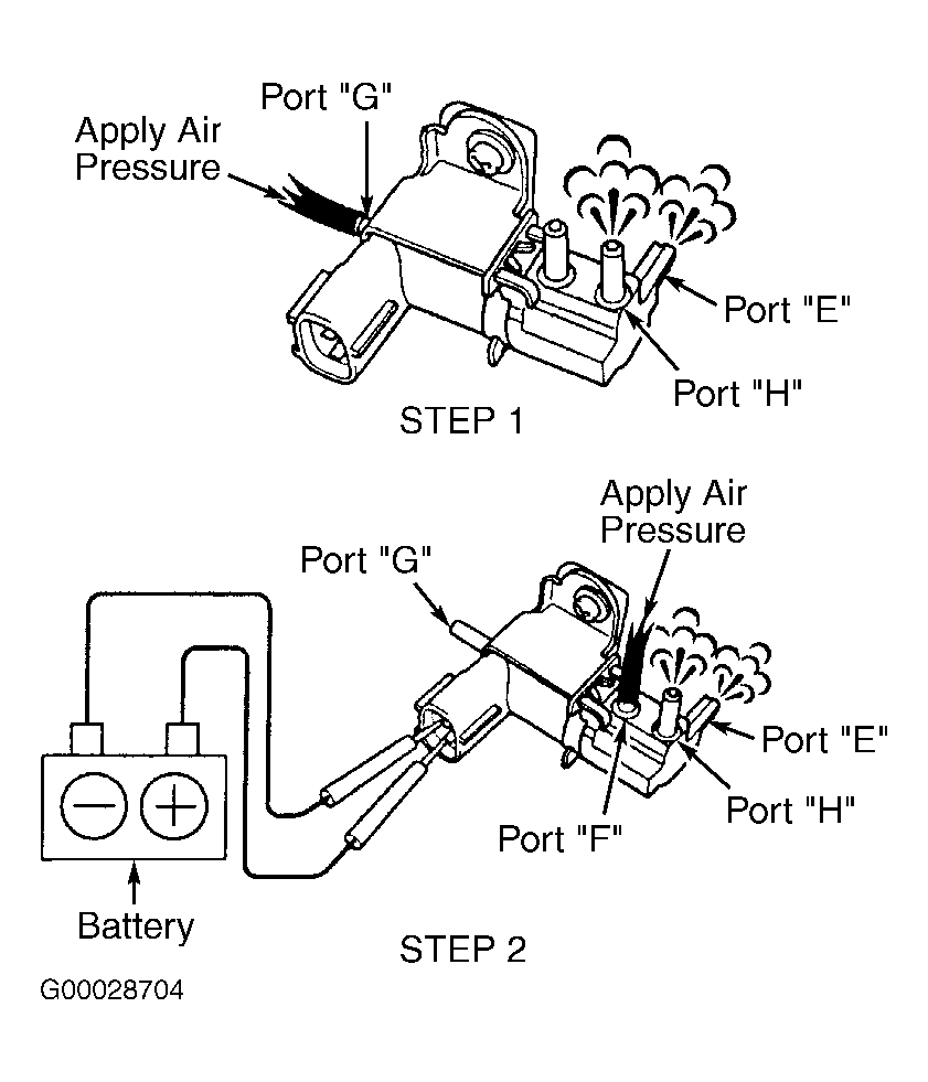 - Remove Active Control Mount Vacuum Switching Valve (ACM VSV). ACM VSV is located near active control engine mount at the front (radiator side) of the engine, just below exhaust manifold. See Fig 1. Apply air pressure to port "G" on ACM VSV. Ensure air flows from ports "E" and "H". Perform STEP 1 in illustration. See Figure. Apply battery voltage and ground to electrical terminals on ACM VSV. Apply air pressure to port "F" on ACM VSV. Ensure air flows from ports "E" and "H". Perform STEP 2 in illustration. See Figure. If ACM VSV operates properly, reinstall ACM VSV. Go to next step. If ACM VSV does not operate properly, replace ACM VSV.