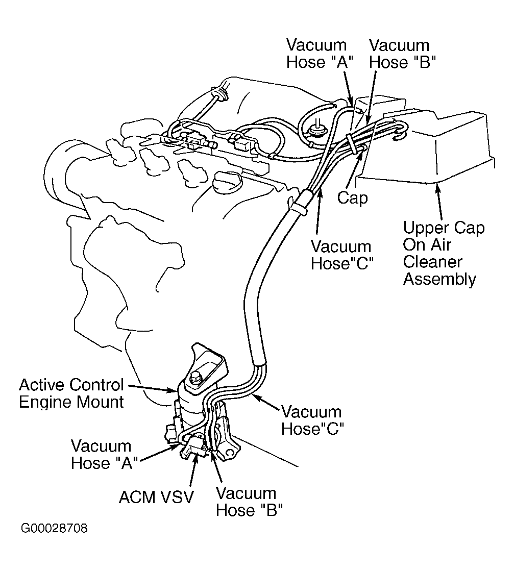- Start engine. Warm engine to normal operating temperature. Chock all 4 wheels and apply parking brake. Depress brake and place transaxle in Drive. Disconnect vacuum hose "A" at upper cap on air cleaner assembly. See Fig 1. Place your finger over end of disconnected vacuum hose "A" and check that suction exists intermittently. If suction does not exist intermittently, shut engine off. Reinstall vacuum hose "A" on upper cap on air cleaner assembly. Go to next step. If suction exists intermittently, shut engine off. Reinstall vacuum hose "A" on upper cap on air cleaner assembly. Active control engine mount system is operating properly.