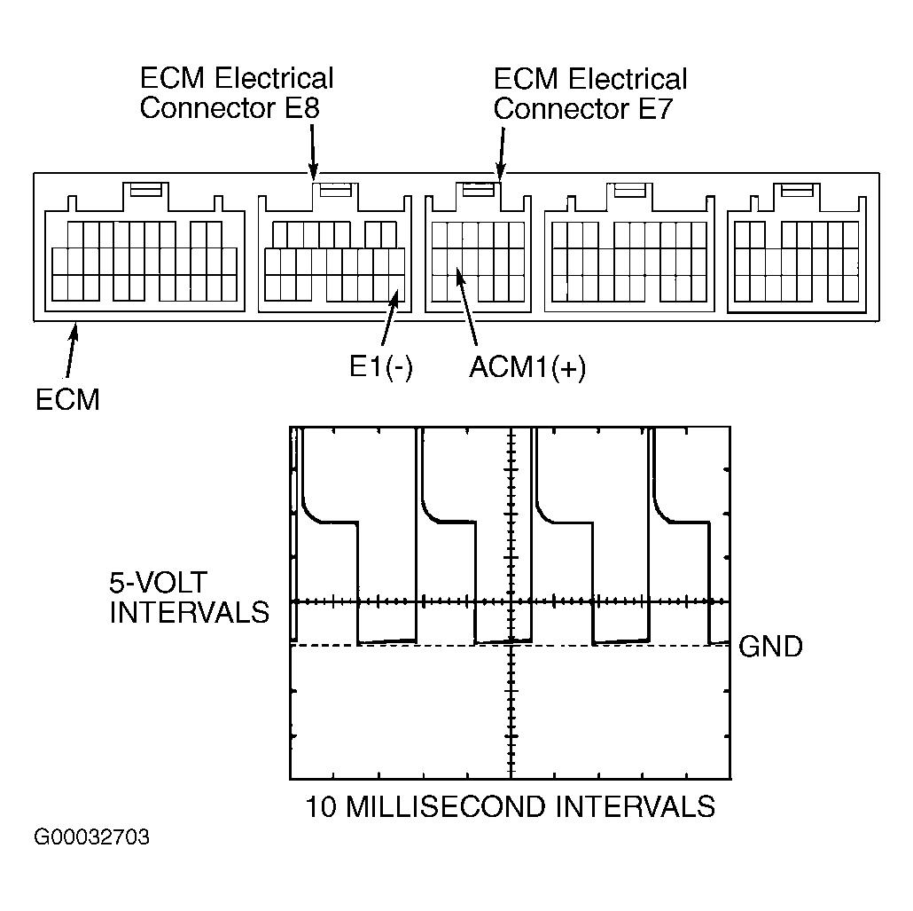 - Remove glove box for access to Engine Control Module (ECM). For illustration of ECM location, see THEORY & OPERATION article. Connect oscilloscope leads between terminal ACM1 (Black wire) on ECM electrical connector E7 and terminal E1 (Brown wire) on ECM electrical connector E8. See Fig 2.