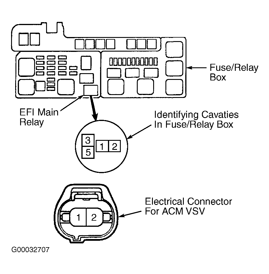 - Ensure electrical connector at ACM VSV is still disconnected. Remove EFI main relay from fuse/relay box at driver's side front corner of engine compartment, near battery. See Fig 3. EFI main relay may also be referred to as EFI relay. To check for open in wiring between EFI main relay and ACM VSV, using ohmmeter, check resistance between cavity No. 3 (Black/White wire) in fuse/relay box for EFI main relay and terminal No. 1 (Black/White wire) on electrical connector for ACM VSV. See Fig 3. If resistance is one ohm or less, go to next step. If resistance is more than one ohm, repair open on Black/White wire between EFI main relay and ACM VSV. See WIRING DIAGRAMS article.