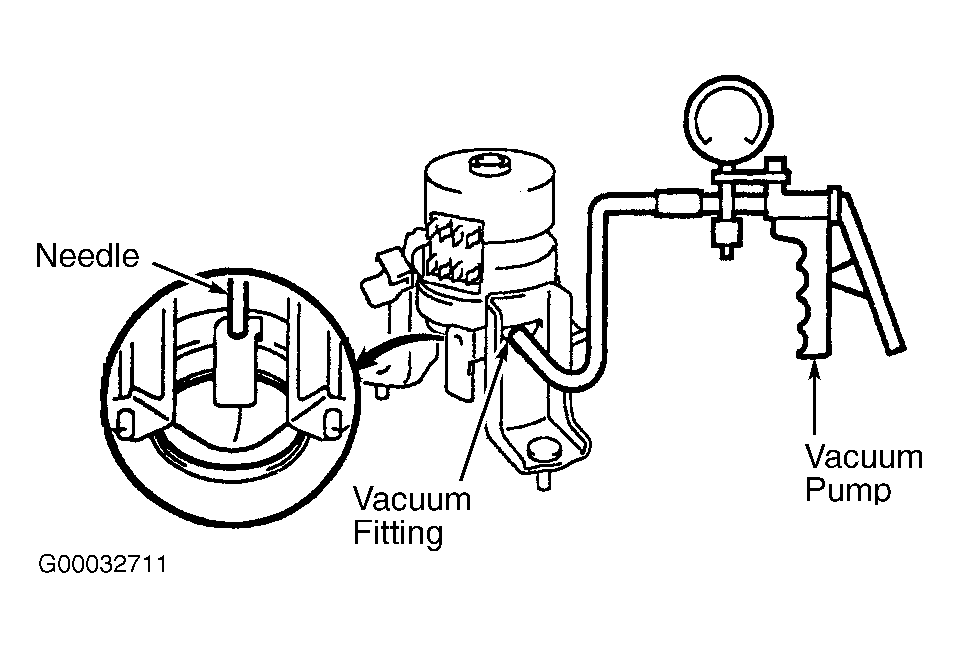 - Disconnect vacuum hose from vacuum fitting on active control engine mount and connect vacuum pump to vacuum fitting. See Fig 4. Using vacuum pump, apply 25.0 in. Hg of vacuum to active control engine mount for at least one minute and check that no change exists is the needle movement. Needle is located at the bottom of active engine control mount. See Fig 4. Check for signs of fluid leakage on active engine mount. If active control engine mount operates properly, active control engine mount system is operating properly. If active control engine mount does not operate as specified or signs of fluid leakage exist, replace active control engine mount.