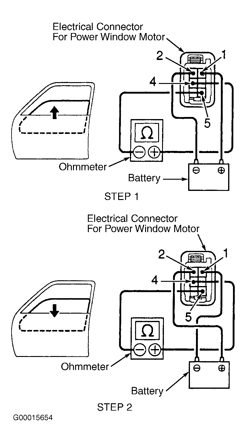 - To check operation of jam protection limit switch in the window downward position, ensure window is fully upward in the closed position. Connect ohmmeter to specified terminals on electrical connector for power window motor. Perform STEP 2 in illustration. See Fig 1. Using jumper wires, apply battery voltage and ground to specified terminals on electrical connector for power window motor. Perform STEP 2 in illustration. See Fig 1. Check that continuity exists when window is going downward and that no continuity exists when window is fully downward in the open position. Remove jumper wires and ohmmeter. If continuity is as specified, jam protection limit switch is okay. If continuity is not as specified, replace power window motor assembly. See POWER WINDOWS - CARS article.