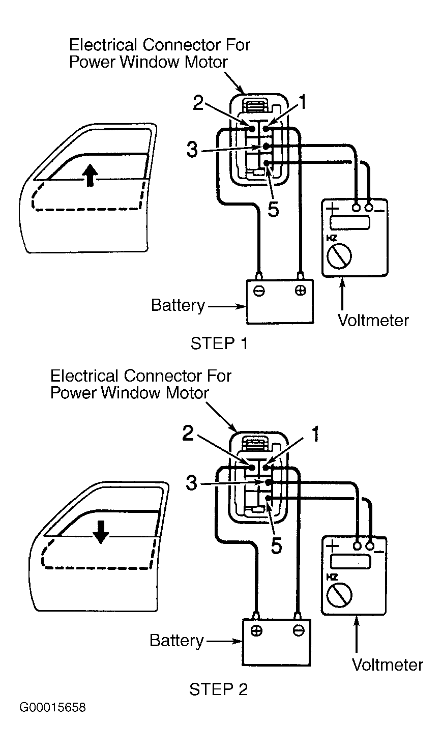 - To check operation of jam protection pulse switch in the window downward position, ensure window is fully upward in the closed position. Connect voltmeter to specified terminals on electrical connector for power window motor. Perform STEP 2 in illustration. See Fig 1. Using jumper wires, apply battery voltage and ground to specified terminals on electrical connector for power window motor so that polarity is reversed. Perform STEP 2 in illustration. See Fig 1. Check that pulse is generated when power window motor is operating and window is moving downward. Remove jumper wires and voltmeter. If pulse is generated as specified, jam protection pulse switch is okay. If pulse is not generated as specified, replace power window motor assembly. See POWER WINDOWS - CARS article.